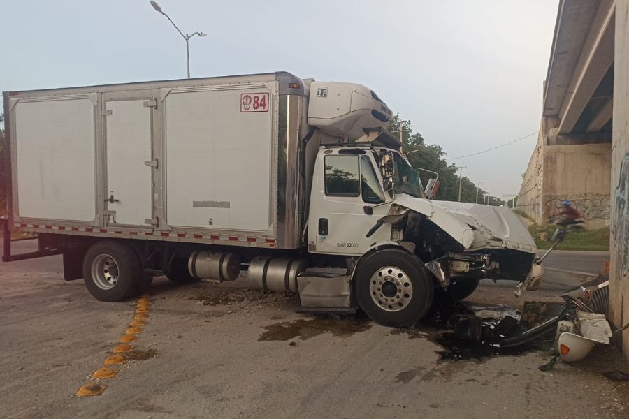 Playa del Carmen.- Un camión de una frutería que venía por la carretera de paga de El Tintal se estrelló contra la base del puente de la avenida Flor de Ciruelos, en el fraccionamiento Villas del Sol de esta ciudad.