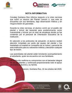 En un comunicado del Colegio Nacional de Educación Profesional Técnica (CONALEP) de Quintana Roo se informa sobre la crisis nerviosa que sufrió un alumno del Plantel Cancún 4.