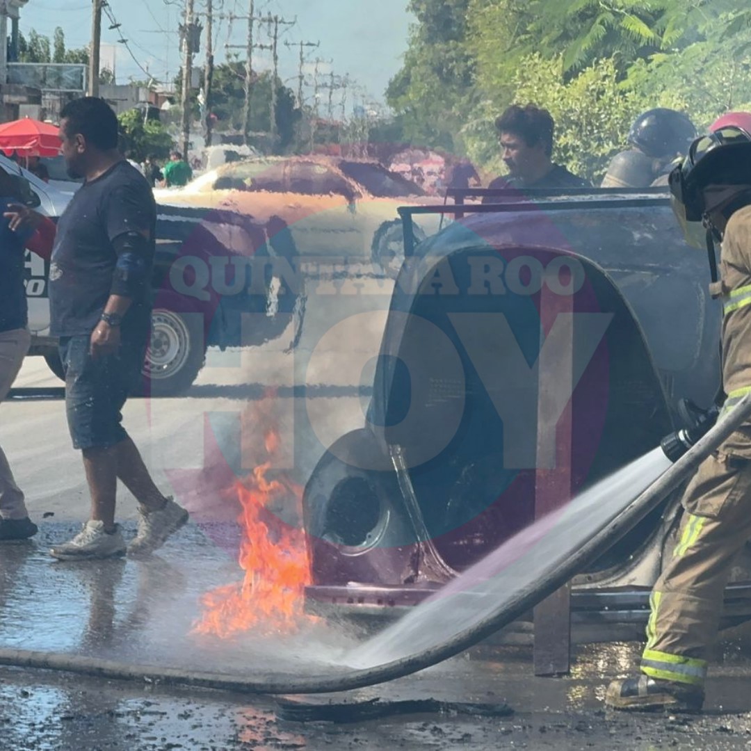 CANCÚN.- Un posible cortocircuito en el sistema eléctrico, combinado con la presencia de gasolina, habría provocado el incendio de un vehículo tipo Volkswagen, que quedó completamente inservible.