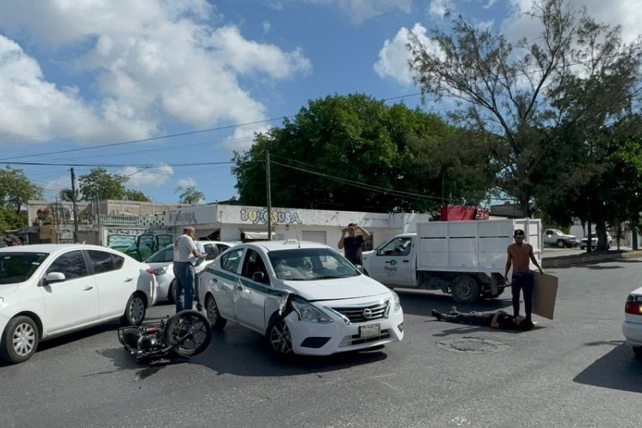 Según testigos, el conductor del taxi Nissan Versa con número económico 6413, afiliado al sindicato “Andrés Quintana Roo”, realizó una maniobra prohibida al intentar girar a la izquierda sin precaución, cortándole el paso a un motociclista que se desplazaba en sentido correcto.