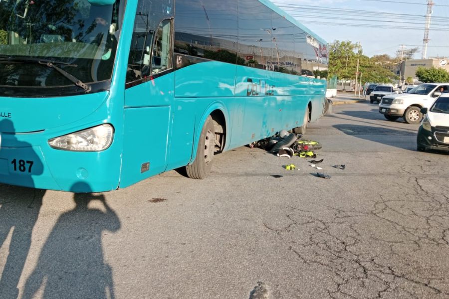 CANCÚN, Q.Roo, 12 de mayo de 2025.- Un motociclista vivió para contarlo, luego de quedar atrapado bajo las llantas de un autobús de pasajeros que le cerró el paso en plena glorieta de Cancún.