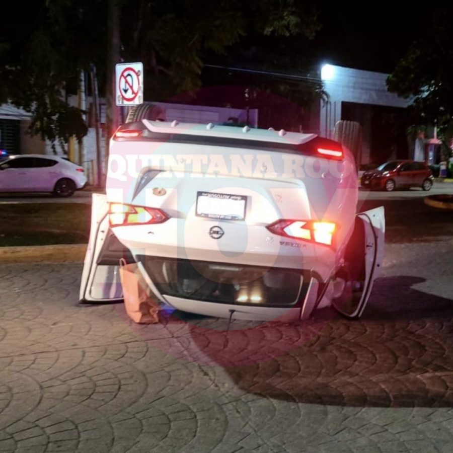 Imprudencia al volante: Nissan volcado frente a la Cruz Roja en Cancún