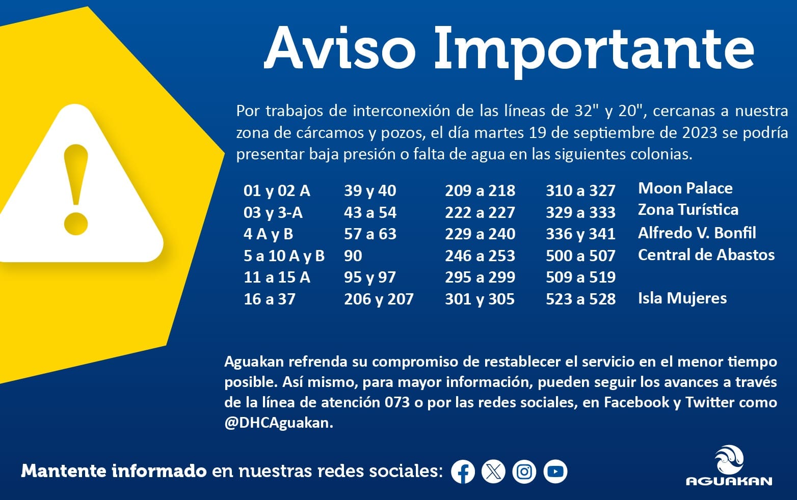 Por lo anterior,en Cancún podría experimentarse baja presión o falta de aguaen las supermanzanas 01a 33,35a37,39,40,43a52,54a57,60a63,90,95,97,206,207,209a218, 222 a 227, 229 a 240, 246 a 250, 253, 295 a 297, 299, 301, 305, 310 a 327, 329 a 333, 336, 337, 341, 500 a 507, 509 a 519, 523 a 528. Así como Moon Palace, Zona Turística, Central de Abastos, Bonfil y Puerto Cancún.