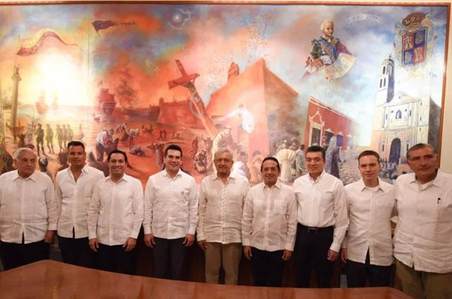 Andrés Manuel López Obrador y los gobernadores de Chiapas, Tabasco, Yucatán, Quintana Roo y Campeche revisaron el anteproyecto para la construcción del Tren Maya que a lo largo de mil 500 kilómetros tocará a las cinco entidades.