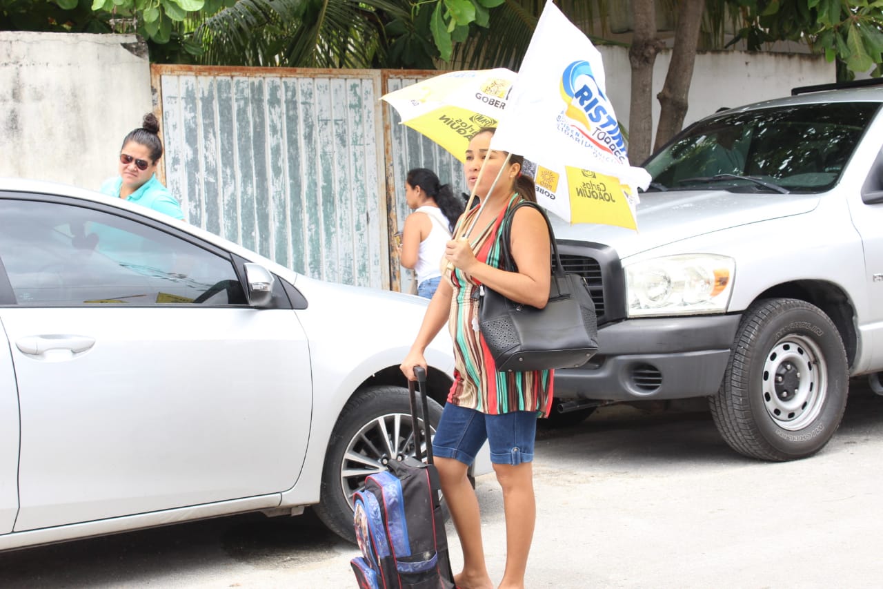 Los niños juegan con globos brillantes con los colores de la coalición por “Quintana Roo al Frente”. De sombrilla amarilla anda la dirigente del PRD en Solidaridad, Alejandra Cárdenas Nájera, su equipo trae las banderas amarrillas. Las playeras naranjas se notan cercanas a Citli Vera, líder de Movimiento Ciudadano. Y con bandera en mano, anda el presidente del PAN en este municipio, Carlos Jiménez. Esa es la escolta de Cristina Torres.