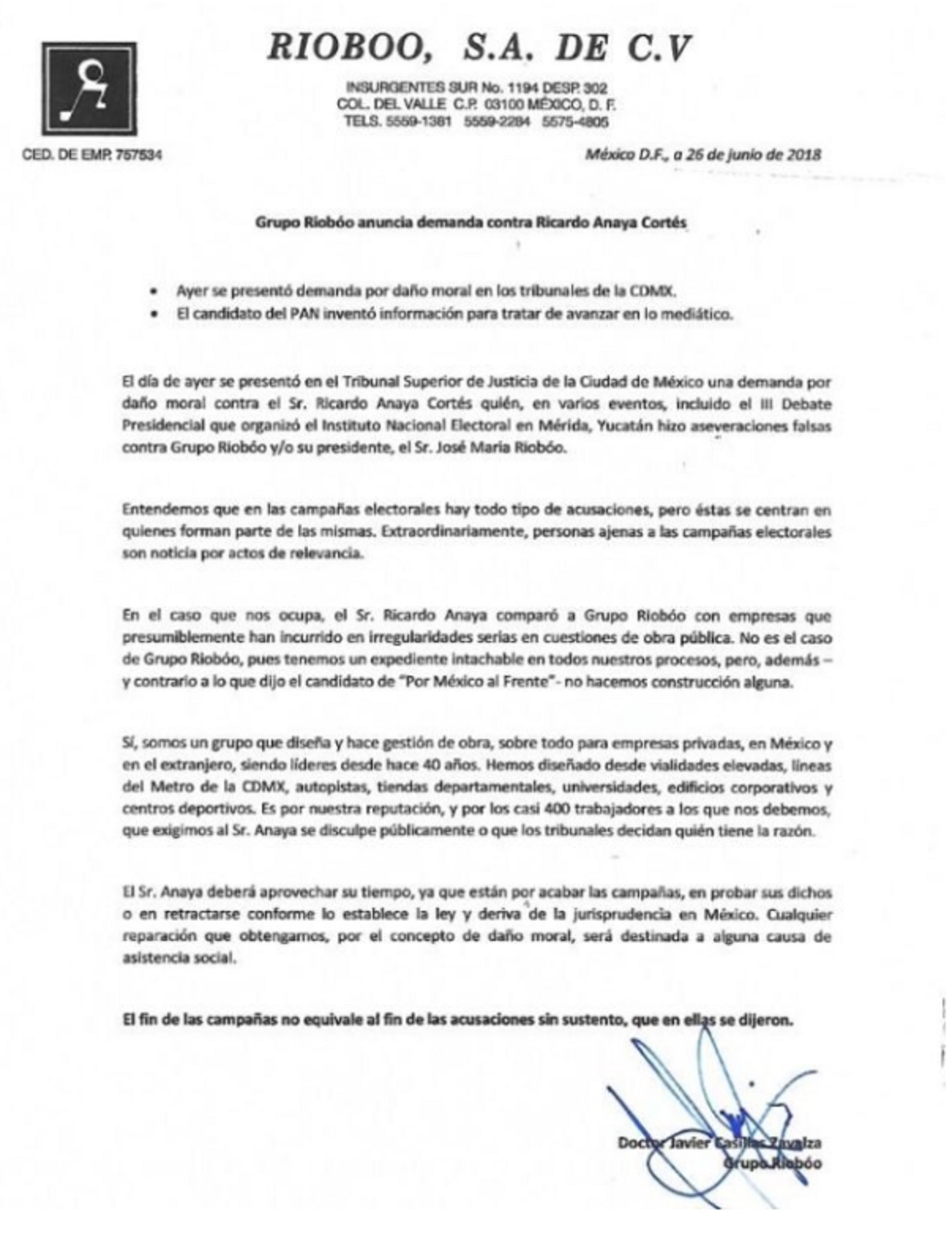 Ciudad de México.- Grupo Rioboó presentó una demanda por daño moral contra Ricardo Anaya, candidato presidencial de la coalición Por México al Frente, ante el Tribunal Superior de Justicia de la Ciudad de México, y además le exigió una disculpa pública.
