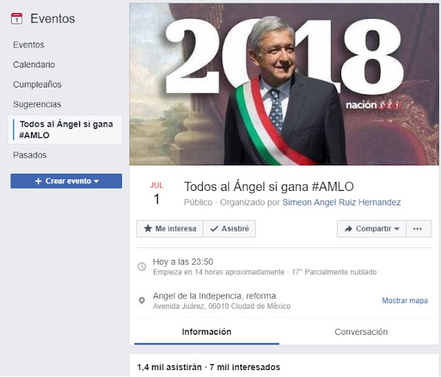 Crean en Facebook evento para acudir al Ángel de la Independencia en caso de que Andrés Manuel López Obrador sea electo presidente: “Todos al Ángel si gana AMLO”.
