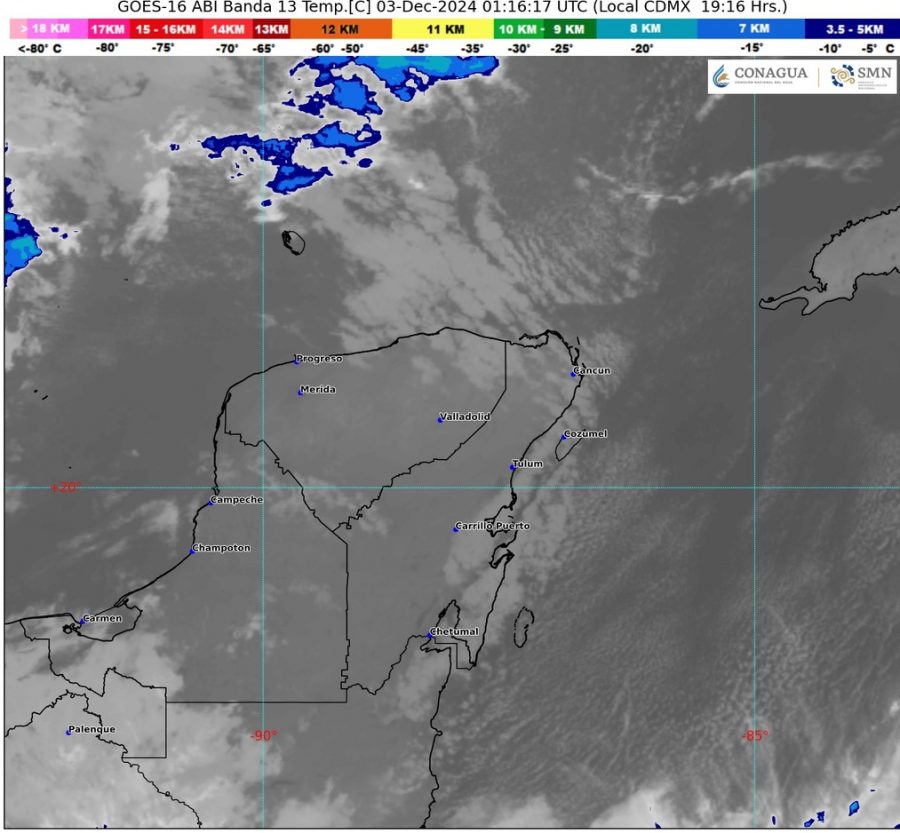 Chetumal.- Para este martes en la Península de Yucatán pronostican cielo medio nublado durante el día y sin lluvia en la península. Por la mañana, ambiente templado y caluroso por la tarde. Viento del este y noreste de 30 a 40 km/h con rachas de 50 a 70 km/h en la región, así como oleaje de 2 a 3 metros de altura en zonas costeras.