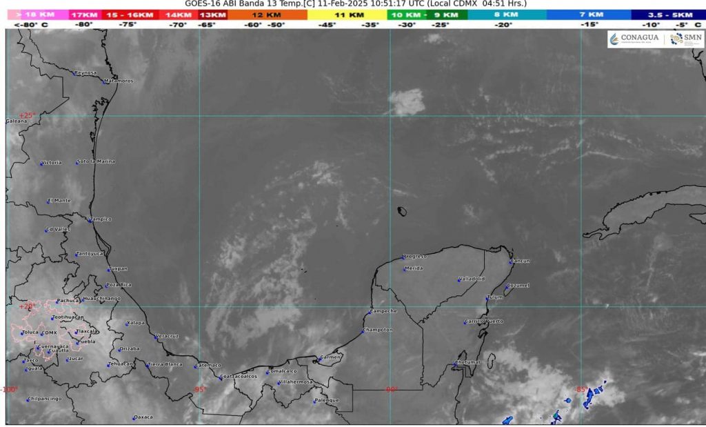 Se mantiene un sistema anticiclónico en niveles medios de la atmósfera sobre el Mar Caribe, la Península de Yucatán y el Golfo de México, sin embargo, la entrada de humedad hacia la región peninsular, originará sobre el estado de Quintana Roo cielo parcialmente nublado con incremento de nublados durante el transcurso del día, lluvias con intervalos de chubascos sobre algunas zonas del estado, el ambiente diurno será muy caluroso y templado a cálido al amanecer. Viento con rachas de 50 km/h principalmente sobre las zonas de costa.