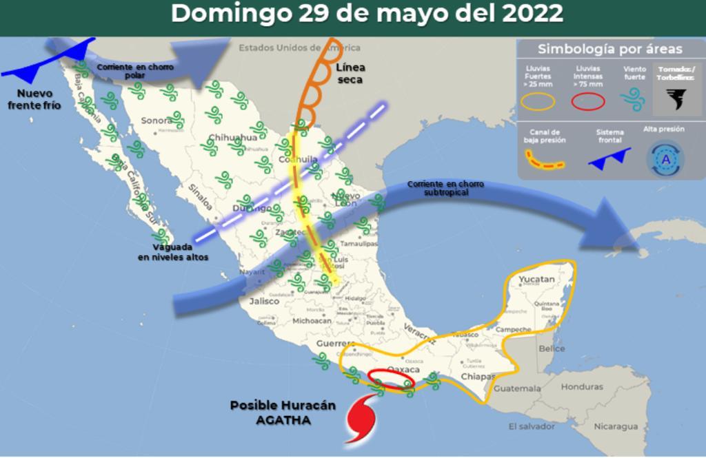 La tormenta tropical “AGATHA” se localiza al sur de las costas de Oaxaca y avanza lentamente hacia el nor-noroeste, previéndose que gire hacia el norte con trayectoria hacia el estado de Oaxaca, intensificándose a huracán de categoría 1 durante las primeras horas de hoy domingo. La amplia circulación del sistema interaccionará con la onda tropical Núm. 2 que recorrerá la Península de Yucatán, ambos sistemas provocarán lluvias fuertes a muy fuertes en el sur y sureste del país, así como en dicha Península, con lluvias puntuales intensas que podrían generar incremento en los niveles de ríos y arroyos