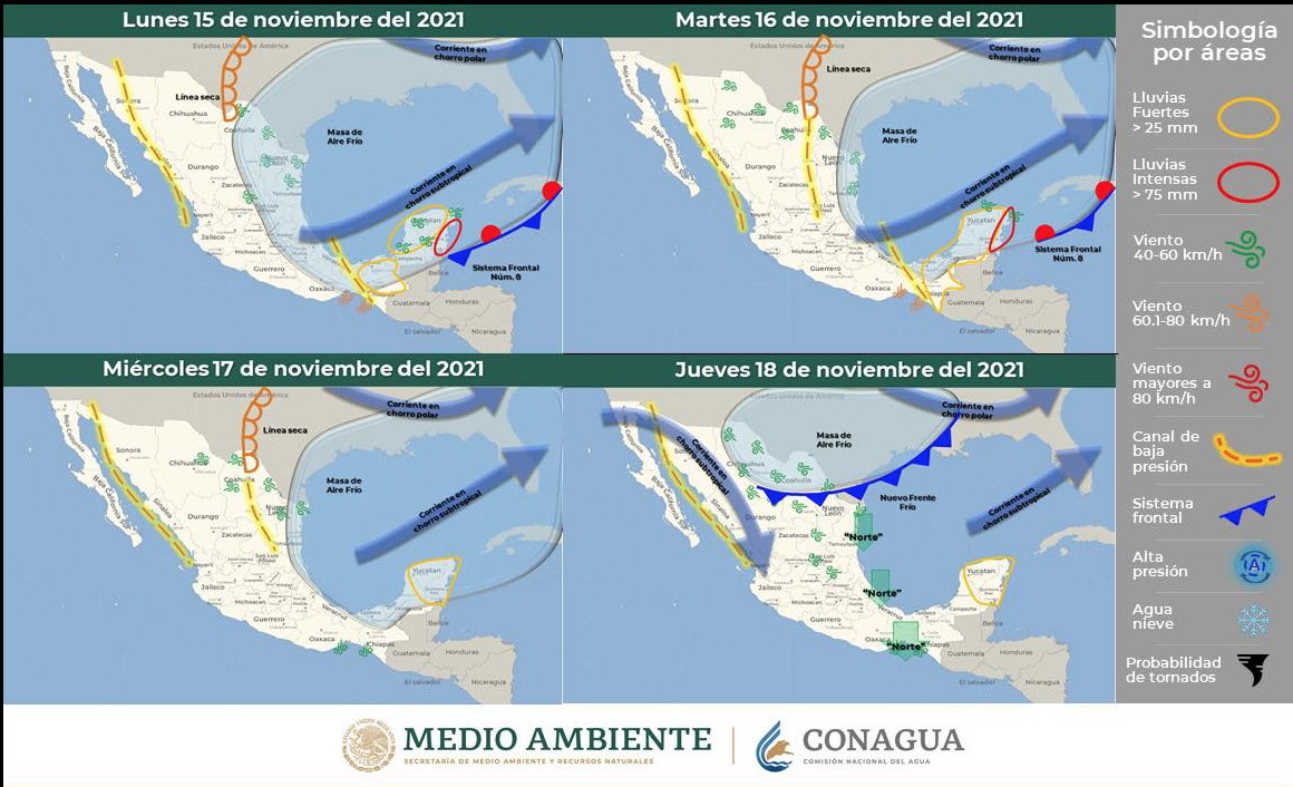 CANTÓN.- Se mantiene el frío número ocho sobre Quintana Roo durante los próximos días con probabilidad de lluvias puntuales muy fuertes, y chubascos para Campeche y Yucatán.