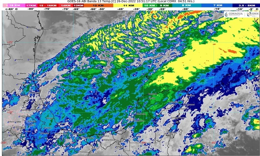 Se mantiene el Frente Frío DIECINUEVE con características de estacionario localizado en superficie sobre la porción occidental del mar Caribe, la masa de aire frío asociada al frente en interacción con la entrada de humedad generada por la corriente de vientos máximos subtropical, continuarán provocando descenso de la temperatura, viento fresco y arrachado del norte y noreste, nubosidad y lluvias ocasionalmente moderadas acompañadas de chubascos con actividad eléctrica, temperaturas frescas durante el día y noches, sobre la mayor parte del Estado de Quintana Roo durante el día y noche.