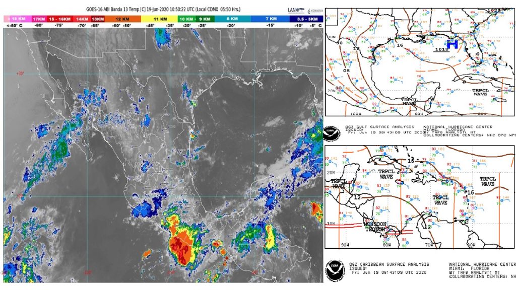 2.- Onda Tropical No. 6 relocalizada en superficie y ubica en la porción central del estado de Chiapas y hasta el Océano Pacifico, en su amplia circulación periférica impulsa aire marítimo tropical del Mar Caribe generando lluvias con algunos chubascos en la porción centro y sur de la Península de Yucatán y Quintana Roo.; la segunda Onda Tropical Localizada en superficie y ubicada en el oriente de la Isla de Cuba y hasta la porción occidental de Colombia; y una tercera Onda Tropical localizada en superficie y ubicada en el oriente de la Isla de Puerto Rico y hasta la porción Media de Venezuela; genera nubosidad variable con lluvias y chubascos aislados ocasionales aso como actividad eléctrica, no presentan condiciones favorables de evolucionar en un sistema tropical, según información del Centro Nacional de Huracanes de Miami, Florida, E.U.A.