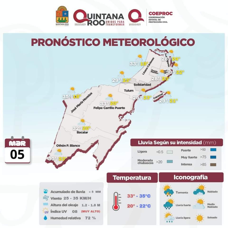 8.- FELIPE CARRILLO PUERTO.- parcialmente nublado, lluvias o lloviznas escasas, viento del sureste y del este de 20 a 30 km/h con rachas más fuertes.