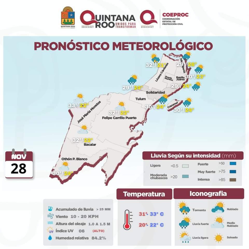 8.-FELIPE CARRILLO PUERTO.- medio nublado a nublado, lluvias ocasionalmente moderadas con chubascos acompañados de actividad eléctrica, viento del este de 15 a 25 kph., con rachas ocasionales.