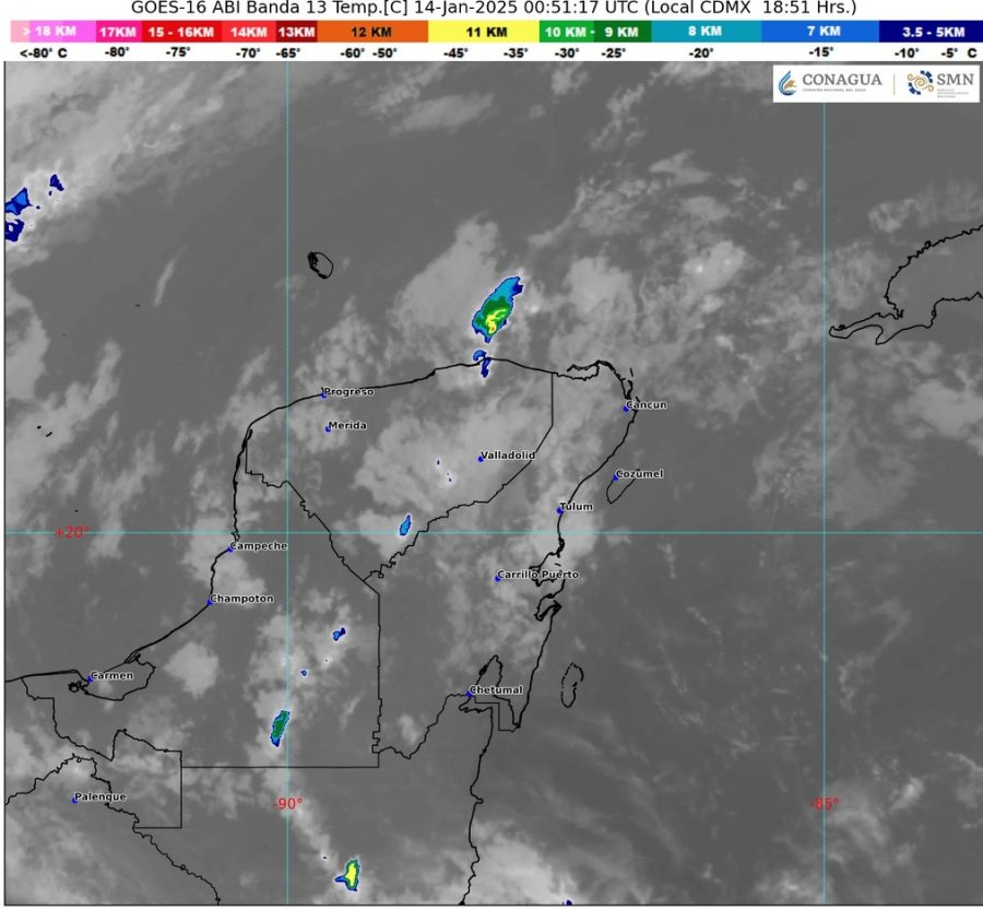 Para la Península de Yucatán habrá cielo medio nublado a nublado con probabilidad de lluvias puntuales fuertes y posibles descargas eléctricas en la región, las cuales podrían originar encharcamientos e inundaciones.