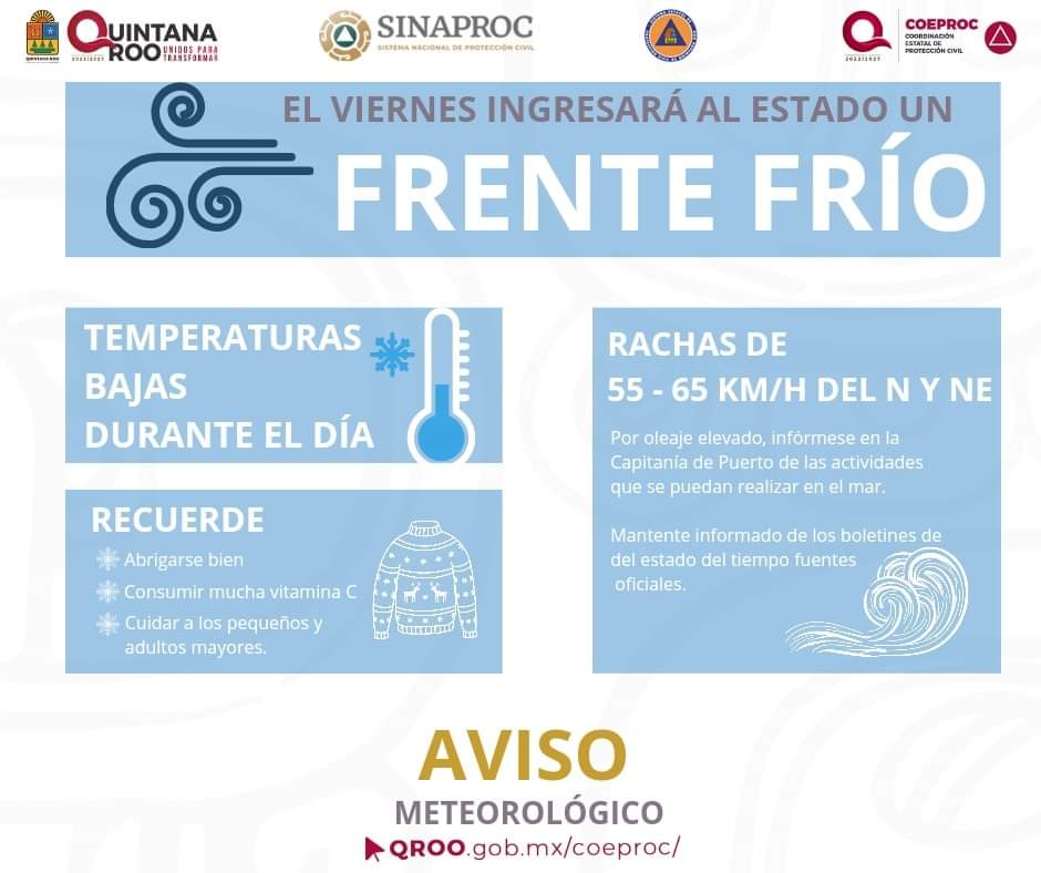 Cancún.- La Coordinación Estatal de Protección Civil dio a conocer a través de sus redes sociales que el día de mañana viernes 23 de diciembre ingresará al estado, el Frente Frío número 19.