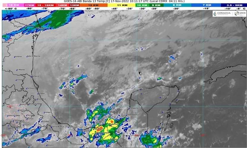 1.- La persistente entrada de aire marítimo tropical con variable contenido de humedad desde el Golfo de México y del mar Caribe hacia la región peninsular, provoca; temperaturas calurosas durante el día y frescas por la madrugada, cielo medio nublado con nublados aislados, lluvias o lloviznas dispersas con chubascos acompañados de actividad eléctrica sobre algunas zonas del estado de Quintana Roo.