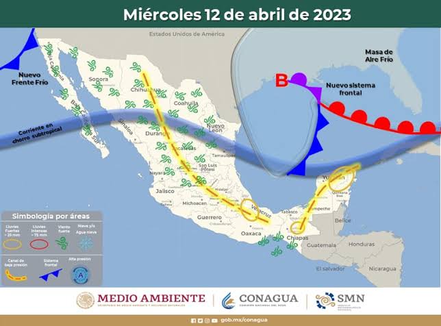Por otro lado, se prevé la formación de un nuevo frente frío sobre el norte y centro del Golfo de México, sin afectar al territorio nacional. Finalmente, continuará el ambiente caluroso a muy caluroso en el litoral del pacífico centro y sur, así como en la Península de Yucatán.