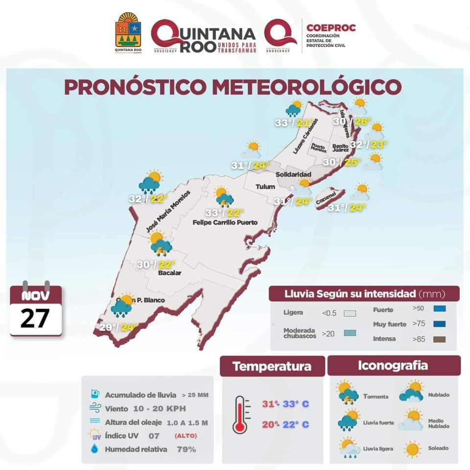 8.-FELIPE CARRILLO PUERTO.- medio nublado a nublado, lluvias con chubascos acompañados de actividad eléctrica ocasional, viento del este de 15 a 25 kph., con rachas ocasionales.