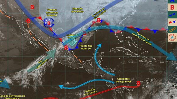 Asimismo, cielo medio nublado durante el día, con chubascos y descargas eléctricas en Campeche (oeste) y Quintana Roo (sur). Sin lluvia en Yucatán. Viento del noreste de 10 a 25 km/h con rachas de 35 a 50 km/h en costas de la península. Oleaje de 1.0 a 2.0 metros de altura en costas de Quintana Roo.