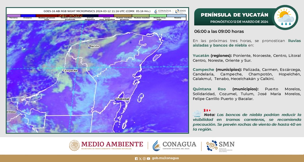 De acuerdo a la @conagua_clima será para las próximas horas se pronostican lluvias aisladas y bancos de niebla para los municipios: