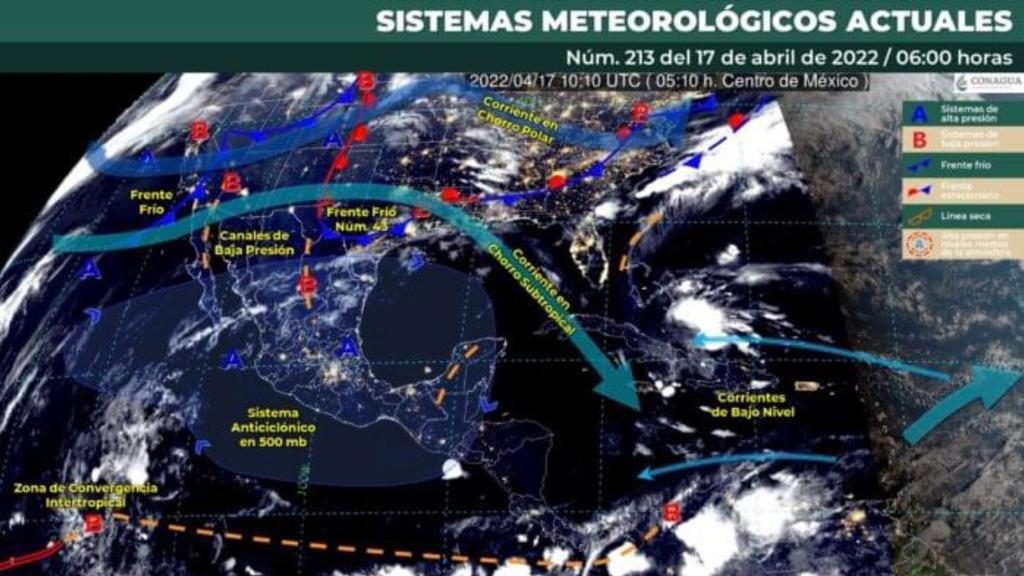 Un sistema anticiclónico en niveles medios de la atmósfera mantendrá la onda de calor con ambiente vespertino cálido a muy caluroso sobre la mayor parte de la República Mexicana, presentando temperaturas superiores a 40 °C en 19 estados del país.