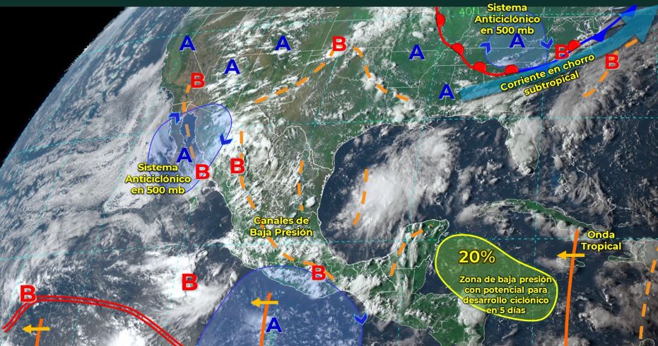 La onda tropical núm. 24, se desplazará frente a las costas de Jalisco y Colima y dejará de afectar a México al final del día, así como con inestabilidad en niveles altos de la atmósfera, originarán lluvias de fuertes a muy fuertes en el norte, occidente y centro de México, así como lluvias puntuales intensas en Guerrero. Por otra parte, un segundo canal de baja presión extendido en el oriente y sureste de México, aunado a la entrada de humedad del Golfo de México y Mar Caribe, provocarán chubascos en Yucatán y Quintana Roo.
