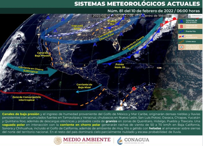 El frente Núm. 28 se extiende sobre el Mar Caribe y ha dejado de afectar a México. Finalmente, en el resto del país dominará cielo parcialmente nublado y escasa probabilidad de lluvia.