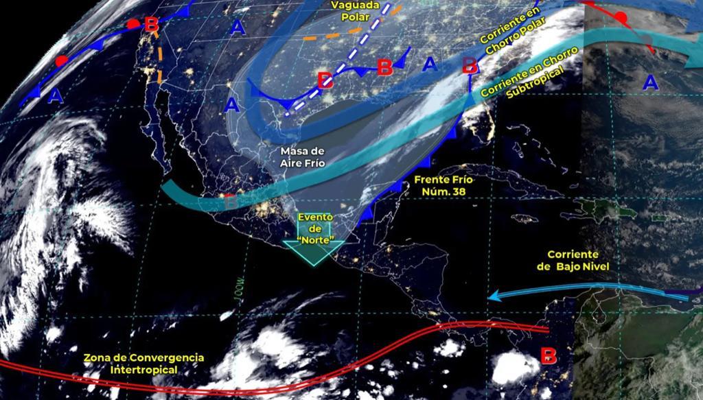 Frente frío número 38 recorrerá la Península de Yucatán y el sureste de México, generando lluvias de fuertes a puntuales muy fuertes, las cuales se acompañarán de descargas