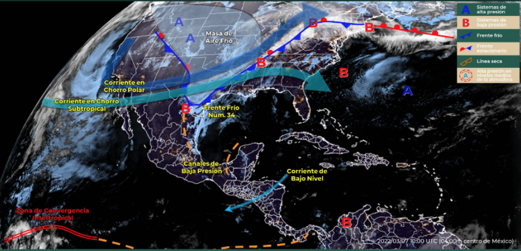 Otro canal de baja presión en el sur del Golfo de México y el ingreso de humedad del Mar Caribe, mantendrán la probabilidad de chubascos en Quintana Roo y lluvias aisladas en el occidente de la Península de Yucatán y el sureste de México.