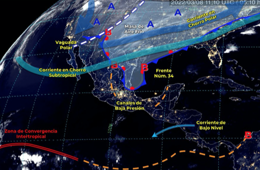 El ingreso de humedad del Océano Pacífico, Golfo de México y Mar Caribe, propiciará lluvias e intervalos de chubascos en el centro, sureste y Península de Yucatán.