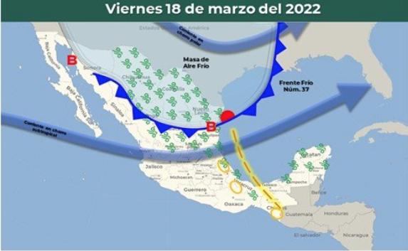 El frente frío Núm. 37 recorrerá el noroeste y norte del territorio nacional y en interacción con un canal de baja presión que se localizará sobre el noreste del país y una vaguada polar que se desplazará sobre la frontera norte, provocarán vientos fuertes a muy fuertes con tolvaneras en las mencionadas regiones.