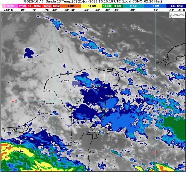 Onda tropical número seis localizada en superficie sobre la porción occidental de la Península de Yucatán, Guatemala, El Salvador, en Centroamérica, y más al sur sobre el océano Pacifico; se mueve lentamente al Oeste, favorece la entrada de aire marítimo tropical con variable contenido de humedad del mar Caribe hacia la región peninsular; origina temperaturas muy calurosas durante el día, cielo medio nublado a nublado; se registraran lluvias con chubascos acompañados de actividad eléctrica aislada sobre algunas zonas del estado de Quintana Roo en el transcurso del día; según información del Centro Nacional de Huracanes de Miami, Florida, Estados Unidos.