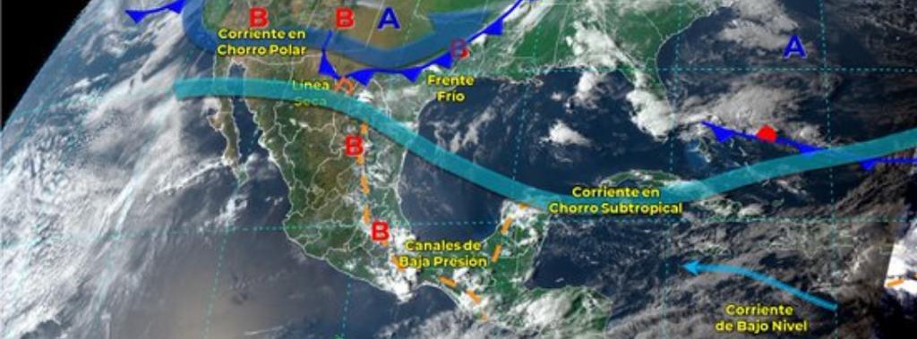 Canal de baja presión sobre estados de la Mesa del Norte y Mesa Central, y otro en el sureste del territorio mexicano, en interacción con la entrada de humedad de ambos océanos y de inestabilidad en niveles altos de la atmósfera, originarán condiciones para lluvias puntuales fuertes acompañadas de descargas eléctricas y posible caída de granizo en Puebla, Veracruz, Oaxaca y Chiapas, así como lluvias con intervalos de chubascos en el centro del país, incluido el Vale de México y la Península de Yucatán.