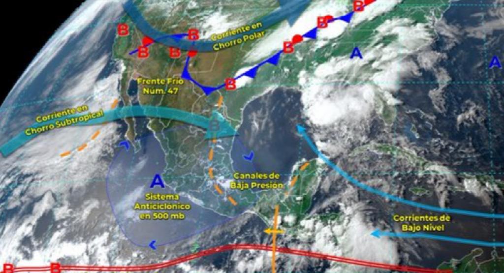 Península de Yucatán: Cielo nublado durante el día con probabilidad de lluvias puntuales muy fuertes en Campeche, así como fuertes en Yucatán y Quintana Roo; todas con descargas eléctricas. Ambiente fresco por la mañana y caluroso a muy caluroso por la tarde. Viento del este de 15 a 30 km/h con rachas de 50 a 60 km/h en la región y oleaje de 2 a 3 metros de altura en costas de Quintana Roo.