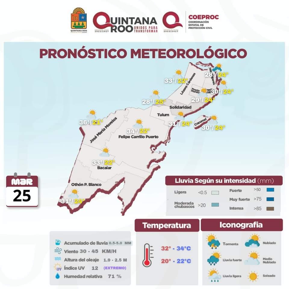 8.- FELIPE CARRILLO PUERTO.- parcialmente nublado, lluvias o lloviznas aisladas, viento del sur y sureste de 40 a 50 km/h con rachas más fuertes.