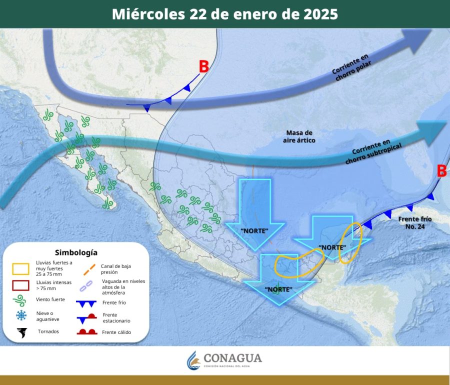 Precisó que esta masa de aire polar se está desplazando hacia Quintana Roo; de ahí que a partir de mañana se comience a notar su influencia en la temperatura de la zona.