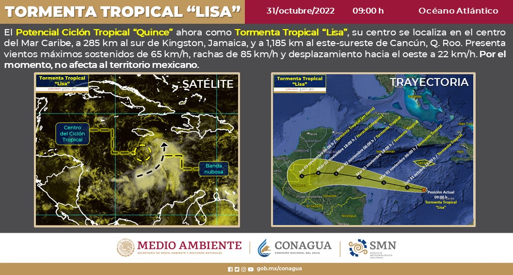 Cancún.- Esta mañana se formó la Tormenta Tropical Lisa en el Mar Caribe, la cual tiene al Sureste de México en su trayectoria, y es por ello que desde ayer, en los municipios del Sur de Quintana Roo se activó la Alerta Azul.