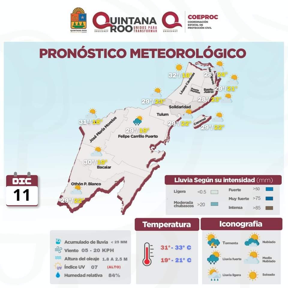 8.-FELIPE CARRILLO PUERTO.- medio nublado a nublado, lluvias o lloviznas dispersas con chubascos, viento del este de 15 a 25 kph., con rachas ocasionales.