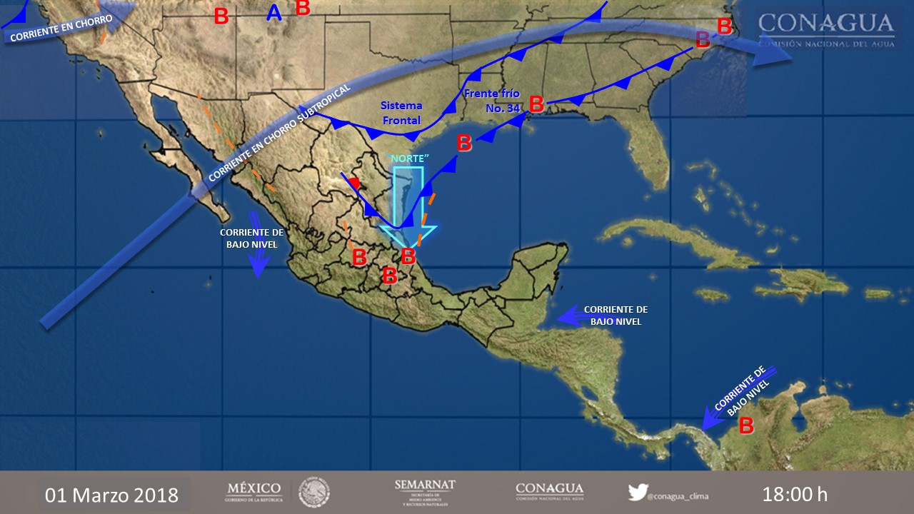 1.- Se mantiene la entrada de Aire Marítimo Tropical con poco contenido de humedad procedente del Golfo de México y Mar Caribe hacia la Península de Yucatán; continúa manteniendo las temperaturas calurosas a muy calurosas, ventoso, nubosidad dispersa con lluvias aisladas ocasionales sobre algunas zonas del Estado de Quintana Roo., más frecuentes por la tarde o noche.
