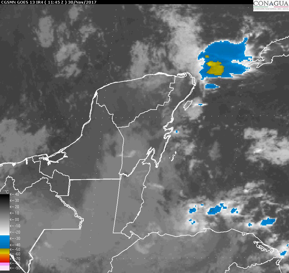 Vaguada (canal de Baja Presión) localizada en superficie sobre la porción noreste de la Península de Yucatán y más hacia el sur en el occidente del Mar Caribe hasta el este de Honduras, C.A.; en su amplia circulación periférica impulsa Aire Marítimo Tropical con variable contenido de humedad hacia la citada Península, originando temperaturas calurosas durante el día y frescas por la noche y madrugada, nubosidad y lluvias dispersas con chubascos ocasionales sobre algunas zonas del Estado de Quintana Roo, más frecuentes sobre la zona norte, por la tarde o noche.