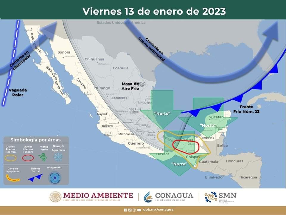 Cancún.-Debido al próximo desplazamiento del Frente Frío número 23 y a la Vaguada prefrontal (Canal de Baja Presión) que lo acompaña sobre el Golfo de México, mismos que se moverán de Norte a Sur, estarán afectando de manera gradual la región peninsular y al estado de Quintana Roo, a partir de la tarde-noche del día viernes generando incremento de nubosidad y lluvias que podrán ser moderadas a ocasionalmente fuertes con chubascos acompañadas de actividad eléctrica, principalmente en los municipios de la Zona Norte del estado.