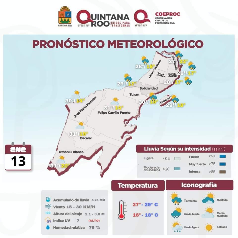 8.- FELIPE CARRILLO PUERTO.- medio nublado a nublado, lluvias que podrán ser moderadas con chubascos acompañados de actividad eléctrica, viento de componente norte de 10 a 20 km/h., incrementándose por la tarde-noche de 30 a 40 km/h., con rachas más fuertes.