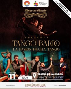 Cancún.- El embrujo del tango argentino tomará el escenario del Teatro de la Ciudad el próximo viernes 11 de julio a las 20:00 horas, con la presentación de Tango Bardo – La pasión hecha tango, un espectáculo vibrante que combina música en vivo, danza y una profunda expresión emocional.