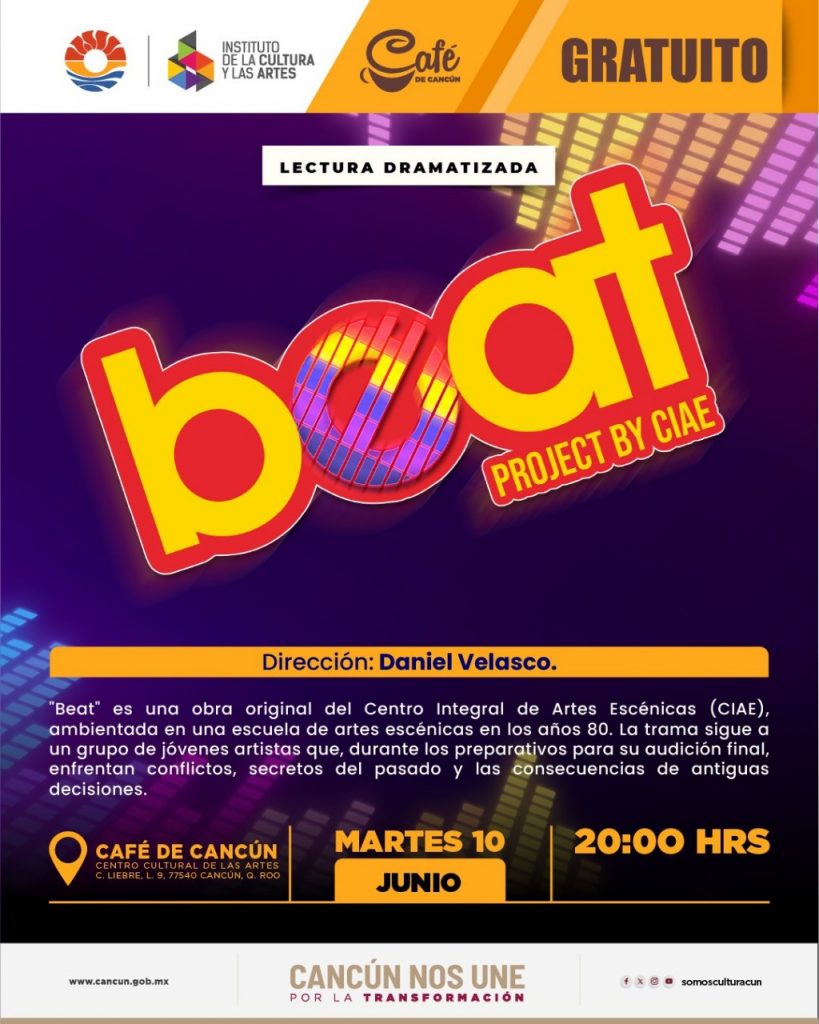 Cultura.- Este martes 10 de junio a las 8:00 p.m., el acogedor ambiente del Café de Cancún se transformará en el escenario perfecto para revivir una década llena de ritmo, sueños y emociones con la lectura dramatizada de “BEAT”, una obra original del Centro Integral de Artes Escénicas (CIAE), bajo la dirección de Daniel Velasco. La entrada es completamente gratuita.