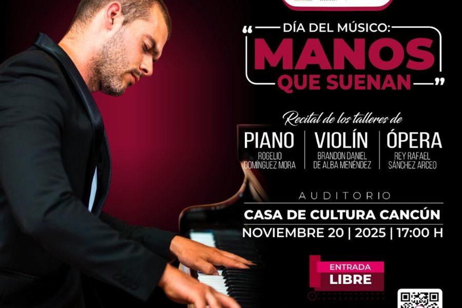 Cancún.- En el marco de la conmemoración del Día del Músico, el Instituto de la Cultura y las Artes de Quintana Roo invita a la comunidad a disfrutar del recital Manos que Suenan, una presentación que reunirá a los talleres de Piano, Violín y Ópera de la Casa de la Cultura de Cancún en una tarde dedicada al talento formativo y al gozo de la música en vivo.