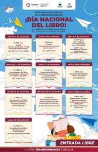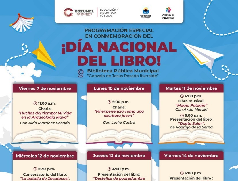 CANCÚN.- Con el propósito de fomentar el gusto por la lectura y acercar a la comunidad al maravilloso mundo de los libros, la Subdirección de Educación de Cozumel ha preparado un programa especial de actividades para conmemorar el Día Nacional del Libro, del 7 al 24 de noviembre, en la Biblioteca Gonzalo de Jesús Rosado Iturralde.