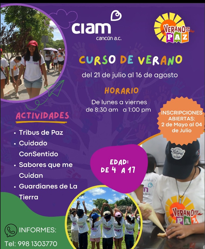 Cultura.- Con el objetivo de promover una cultura de paz, el Centro Integral de Atención a las Mujeres CIAM Cancún A.C. lanza una nueva edición de su esperado curso de verano: Verano por la Paz, un espacio formativo, seguro y enriquecedor para niñas, niños, adolescentes y juventudes.