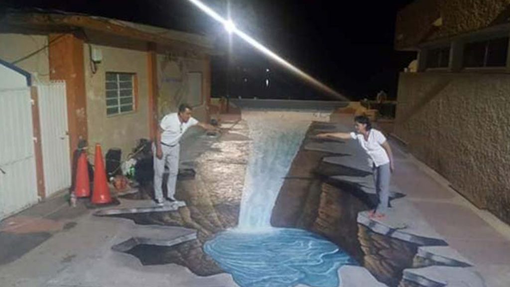 Con esta obra, el artista tabasqueño logra una pintura 3D con una profundidad visual como si la grieta, su altura y el fondo con agua fueran reales.